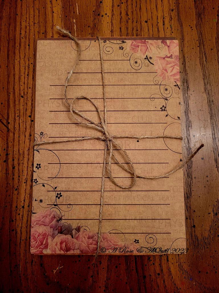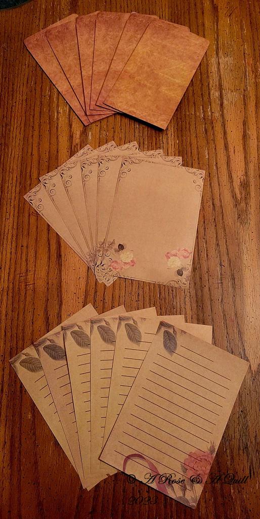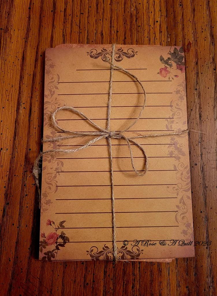 An 18 pc. set of Rose patterned stationary designed on aged Antique style Kraft paper with the warmth of the matching envelopes is tied with natural jute twine. A Kraft gift tag with a bronze key adds a Vintage touch.