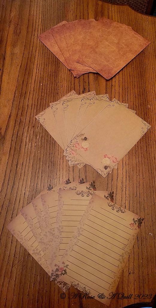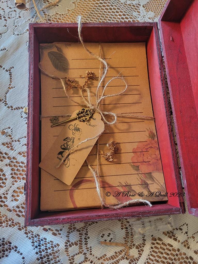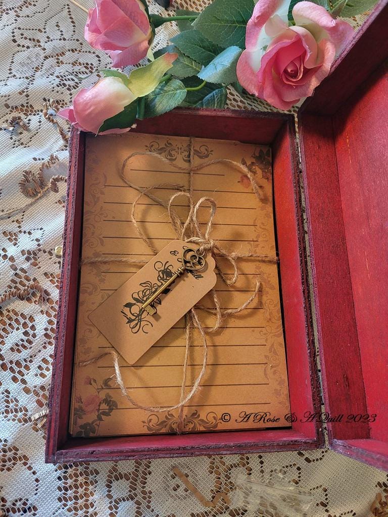 ~The Vintage Rose Stationary Gift Set introduces you to the distinguished style of letter writing. An Antique style wooden box with rustic bronze trim is lined in black velvet with a Rose painted on the inside lid.