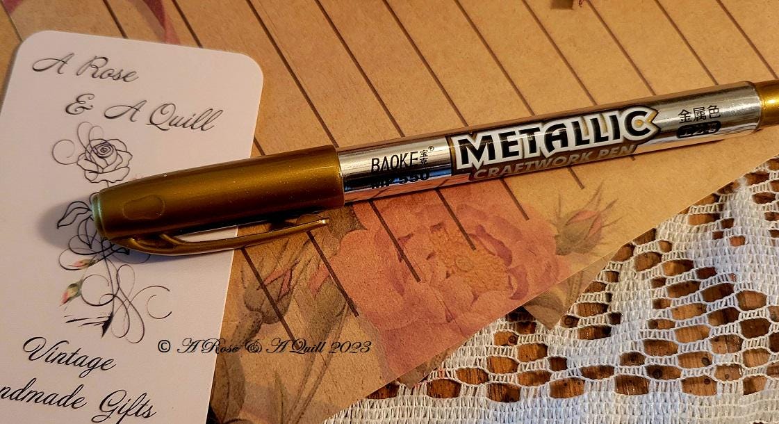 A delicate brass Rose stamp gives a Beautiful, Vintage look to seal & enclose your envelopes. A gold tone metallic marker outlines & frames your stamped Rose.