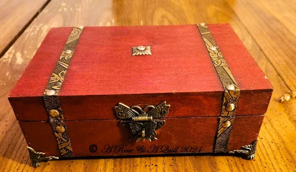 Set inside an Antique style wooden box with rustic bronze trim is lined in black velvet with Antique bronze decoratively engraved leg corners & a bronze Butterfly hasp latch for locking your gift box.