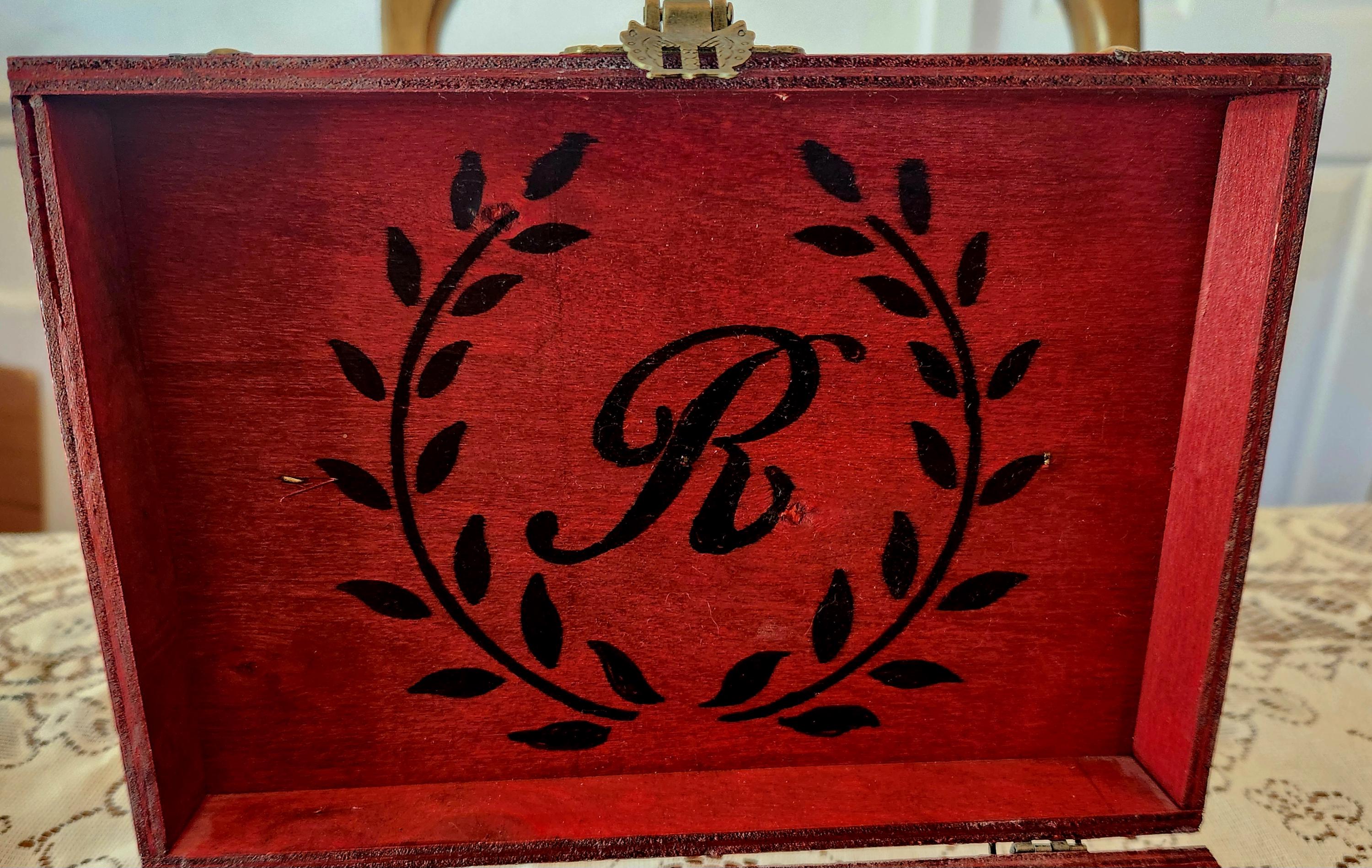 Your Monogram is painted in a Laurel Wreath on the inside lid.
