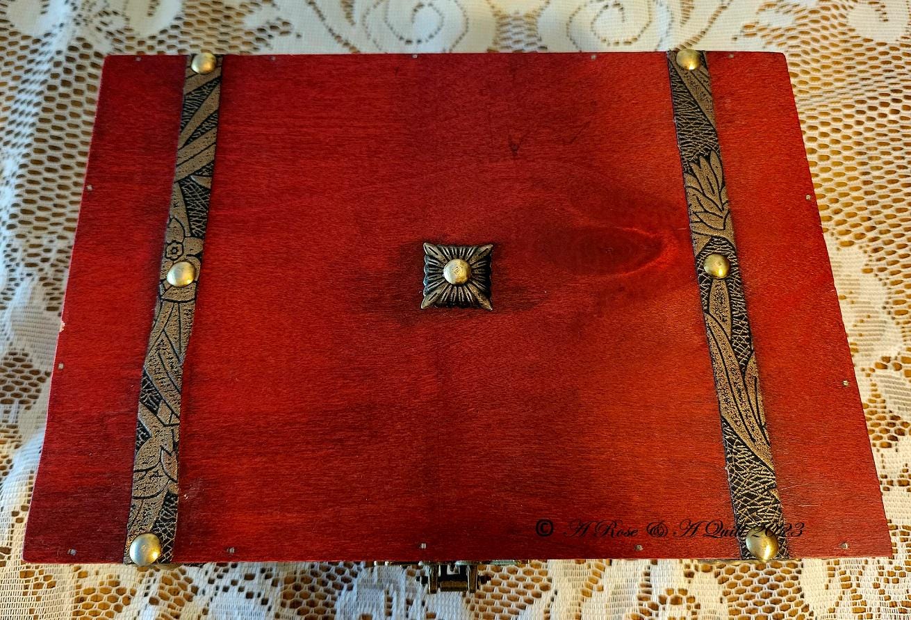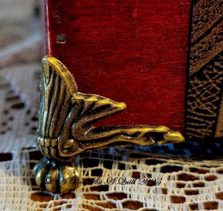 Set inside of an Antique style wooden box with rustic bronze trim is lined in black velvet with Antique bronze decoratively engraved leg corners & a bronze Butterfly hasp latch for locking your gift box.